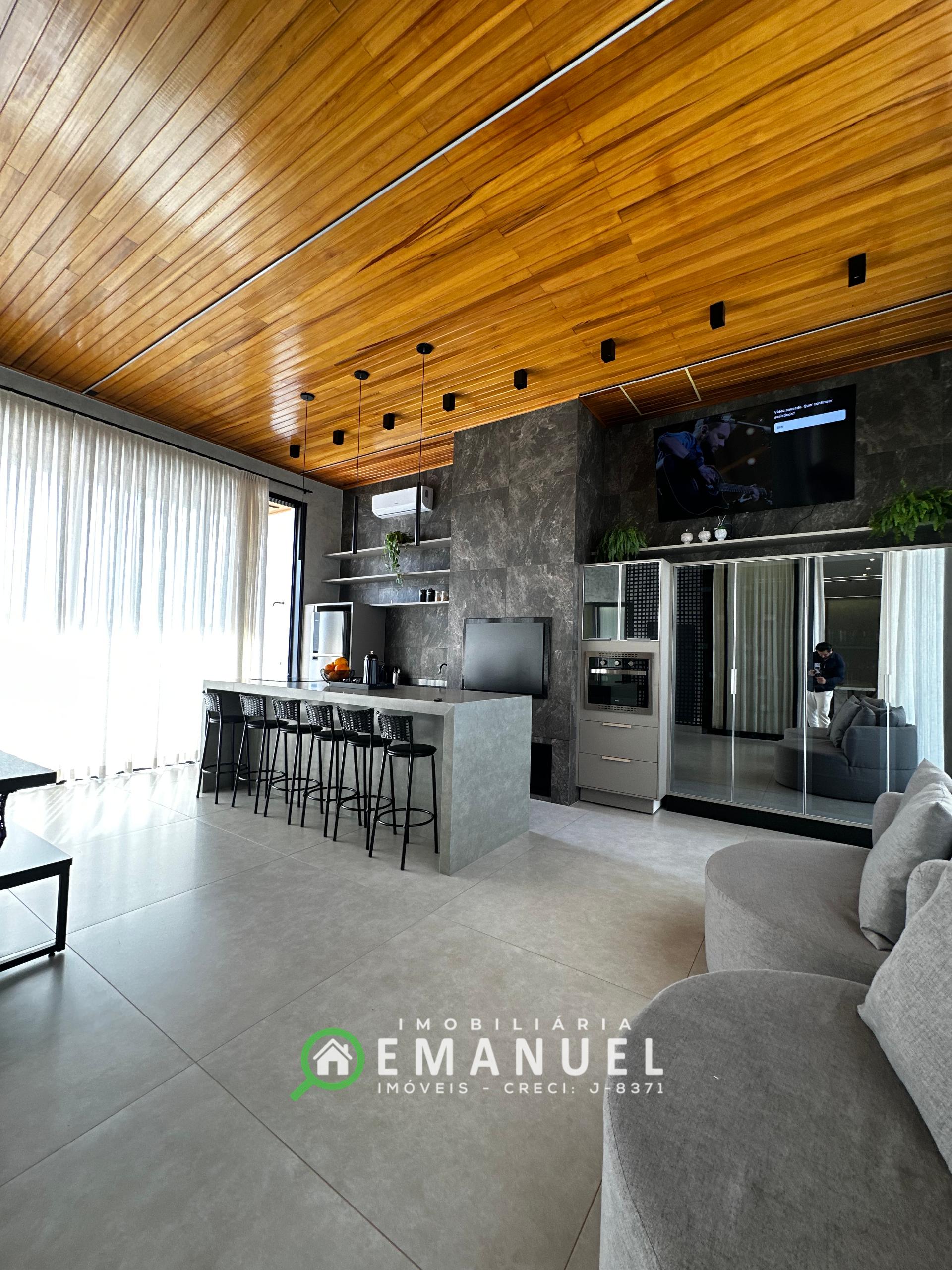 Ambientes amplos e integrados, incluindo sala de estar, cozinha moderna e varanda gourmet com vista panorâmica.